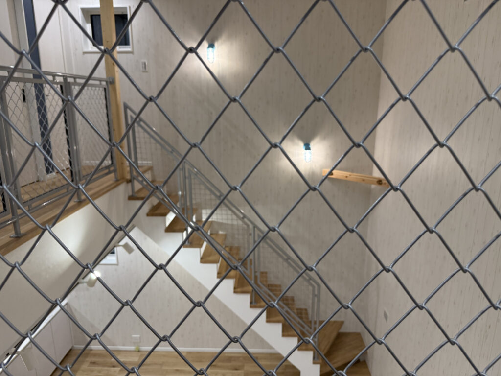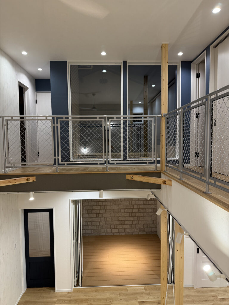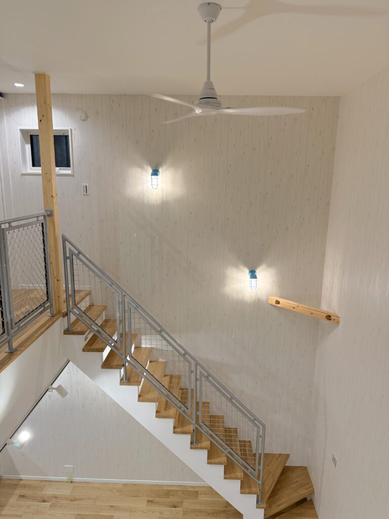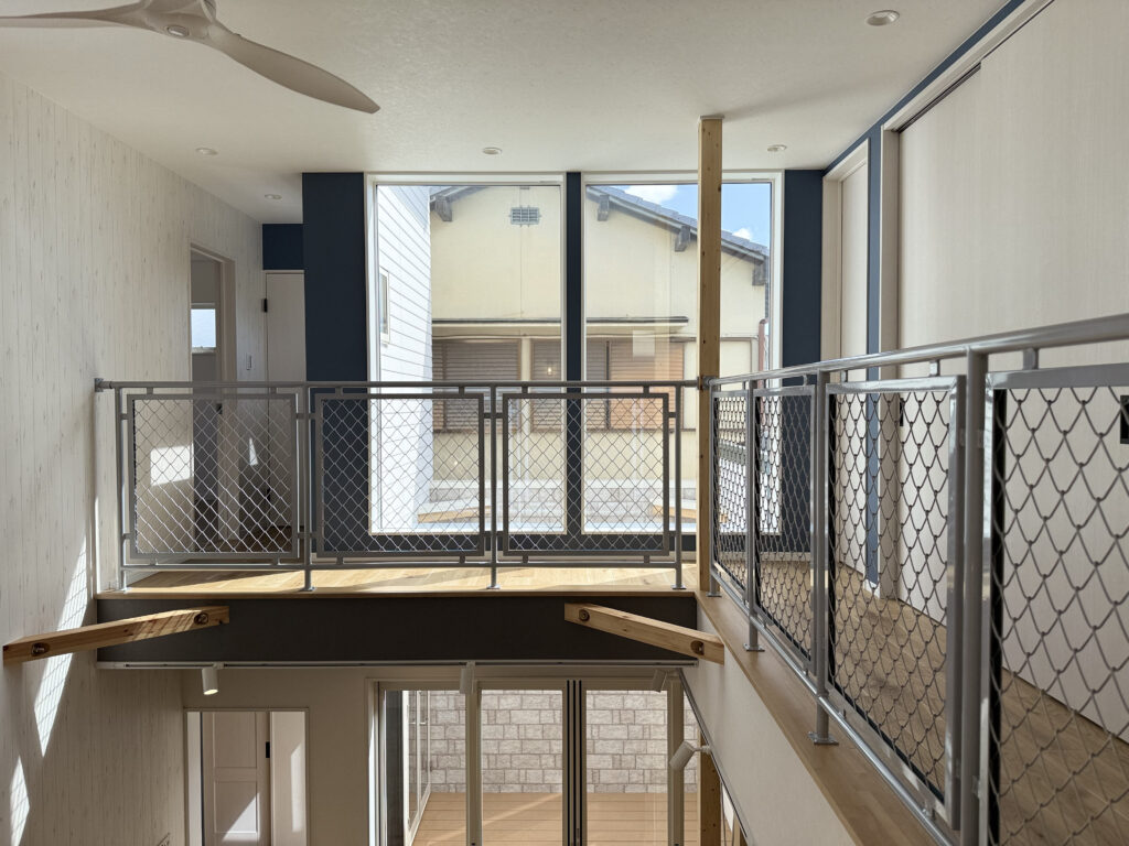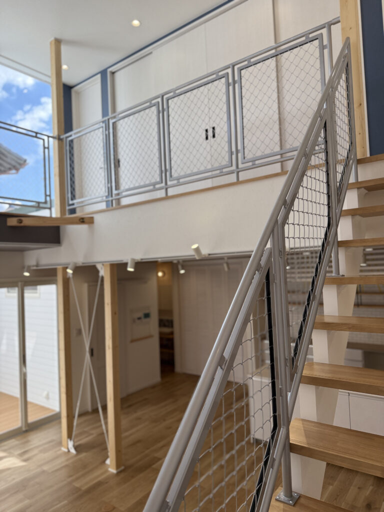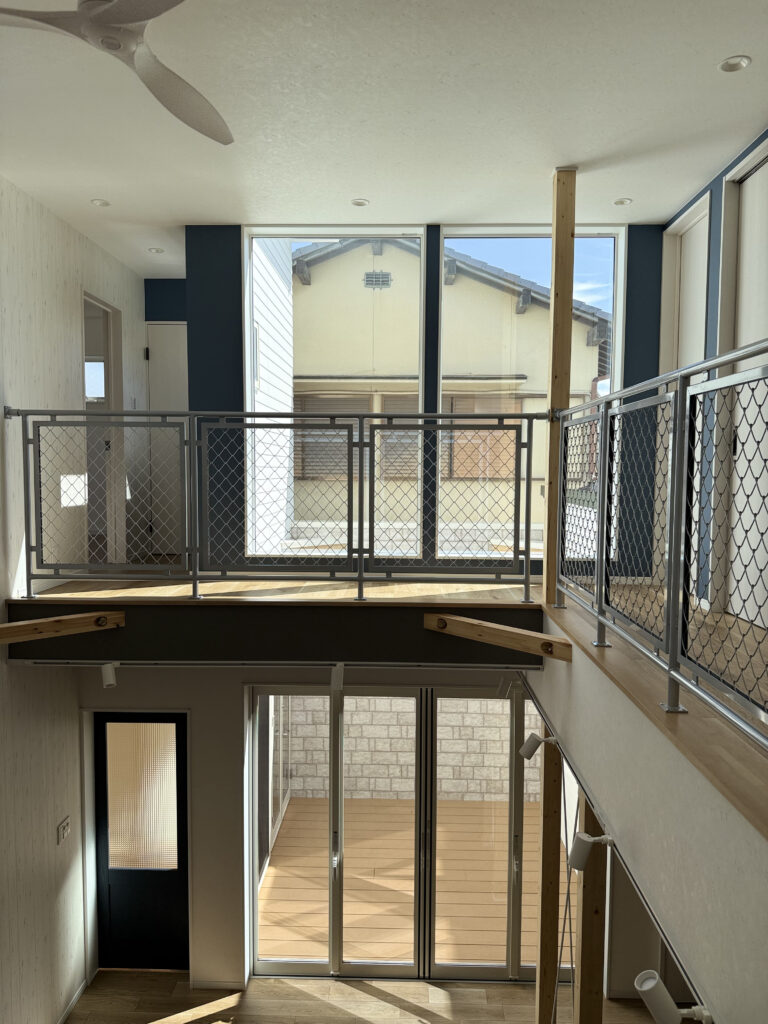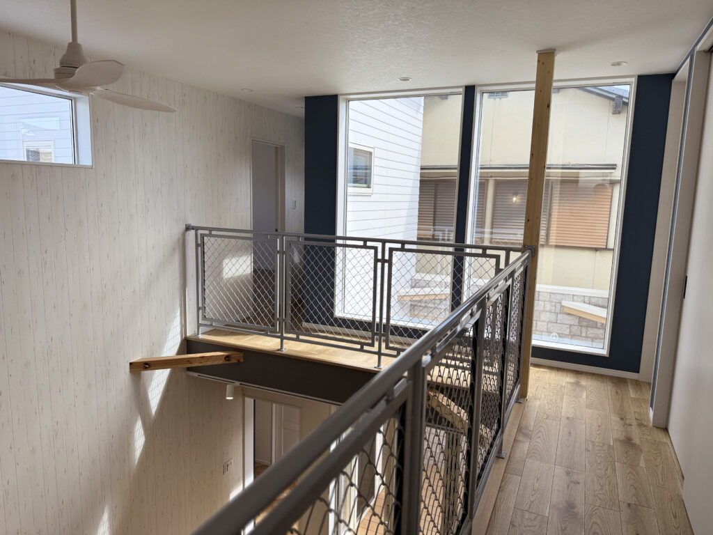上を見上げるとこだわりのアメリカンフェンス風の手すり。