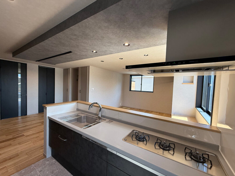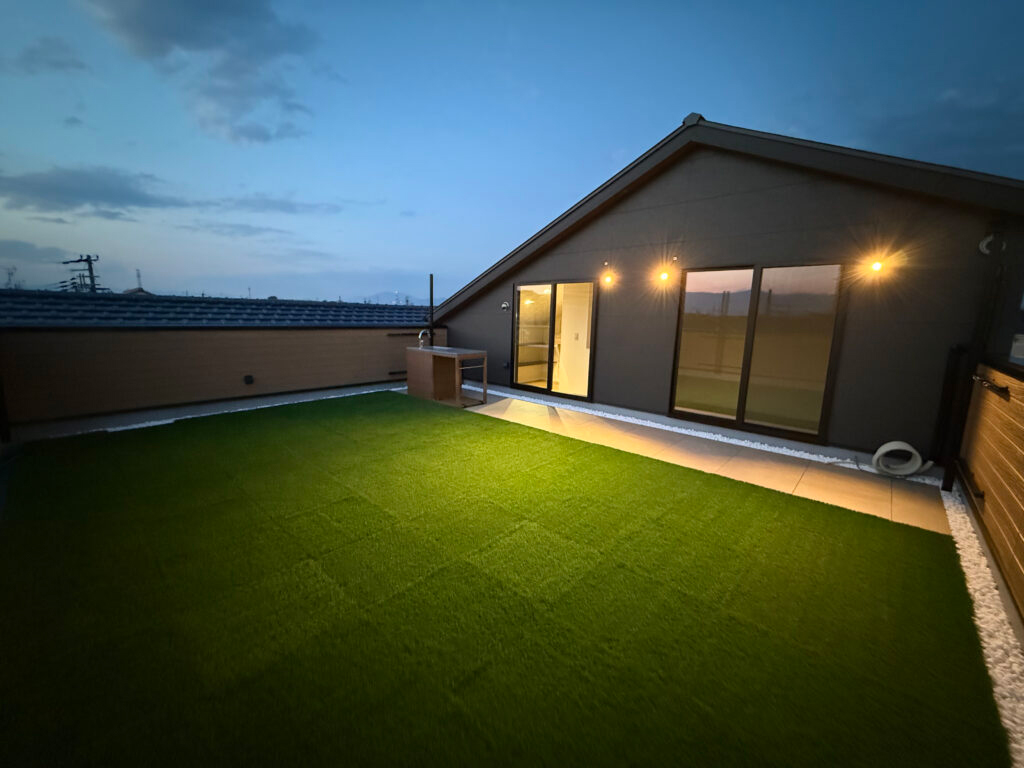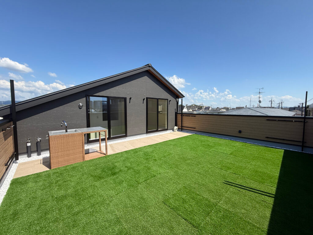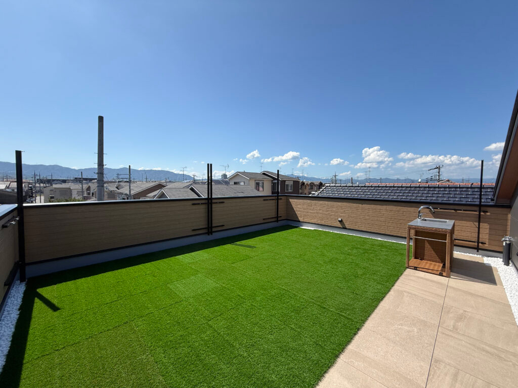 アウトドアが大好きなご家族。『屋上付きのお家を建てたい』とのご相談から夢のお家の打合せが始まりました。「広い屋上でわんちゃんのドッグランやキャンプをしたい」それを叶えるために人工芝の面積を多く取り、またお料理もできるようにガーデンシンクも配置。アウトドア用品を収納できるように屋上出入口部分に大容量収納も。リビングは沢山のお友達が来た時にも対応が出来るようにテーブルに合わせたL字カウンター。