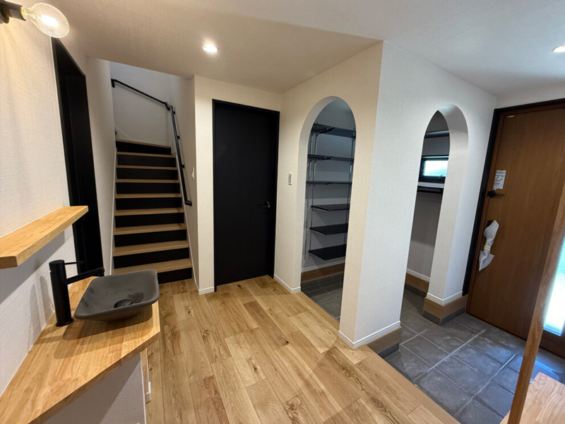 パントリーや水廻りの動線も完璧に。Washroomは家事が窮屈にならないよう広々と、乾太くんも設置し家事効率がGood。ご主人様の1番のこだわりは浴室でミストサウナ。そして浴室から直接外空間に出られるように。各個室などは各々の好きな色を選定しました。玄関ホールなどにも手洗いやニッチ、その他こだわりが沢山。