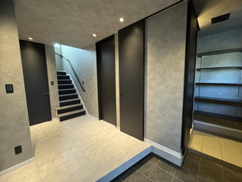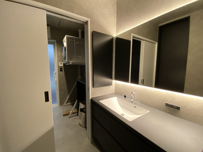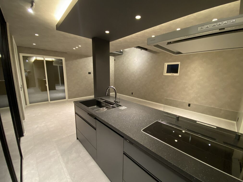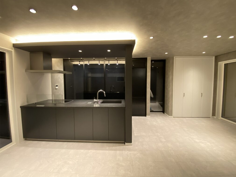 当建物は上記の問題点をポジティブにとらえ、南の陽を1階のリビングに届くように隣地から離した箇所に吹き抜けを設計。デザインは全体をモノトーンに仕上げた。カップボードの扉もオーダー製作。動線にも意識をし玄関→SIC→洗面→脱衣→お風呂まで一直線。洗面と脱衣室を分けることで家族内のプライバシーも。