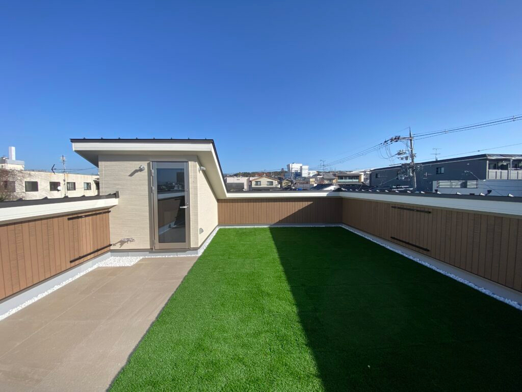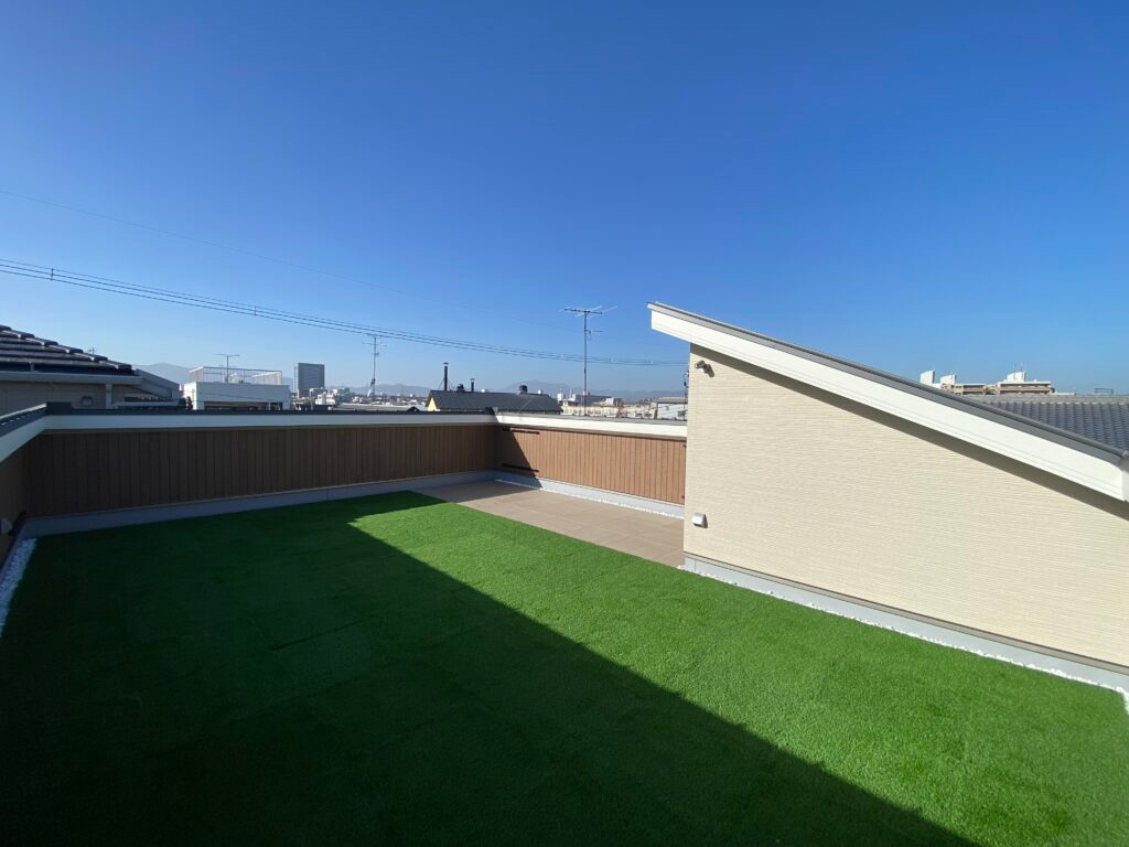 地域の方のために銭湯を営んでいたご夫婦が銭湯を閉業し、次はご自身の為に住みやすい家を要望され計画した家。生活のしやすい動線に外で遊ぶことが大好きな、お孫さんの為に沢山遊べる、そして気持ちの良い日光浴のできる屋上を計画しました。景観地区にあるこちらの場所は屋上の計画は基本的には難しい場所でしたが外観を工夫し、景観も配慮した京都ならではの屋上計画となりました。屋上からは桃山城も見え、とても良い景色が広がります。私自身がいつも意識する『光をたくさん取り入れる』家の計画も上手くいきとても気持ちの良さそうな光が室内にいつも広がります。